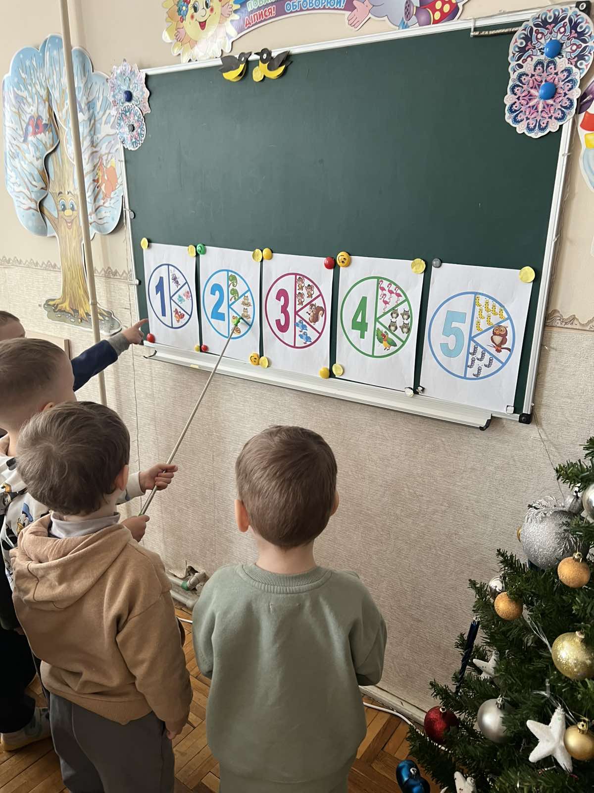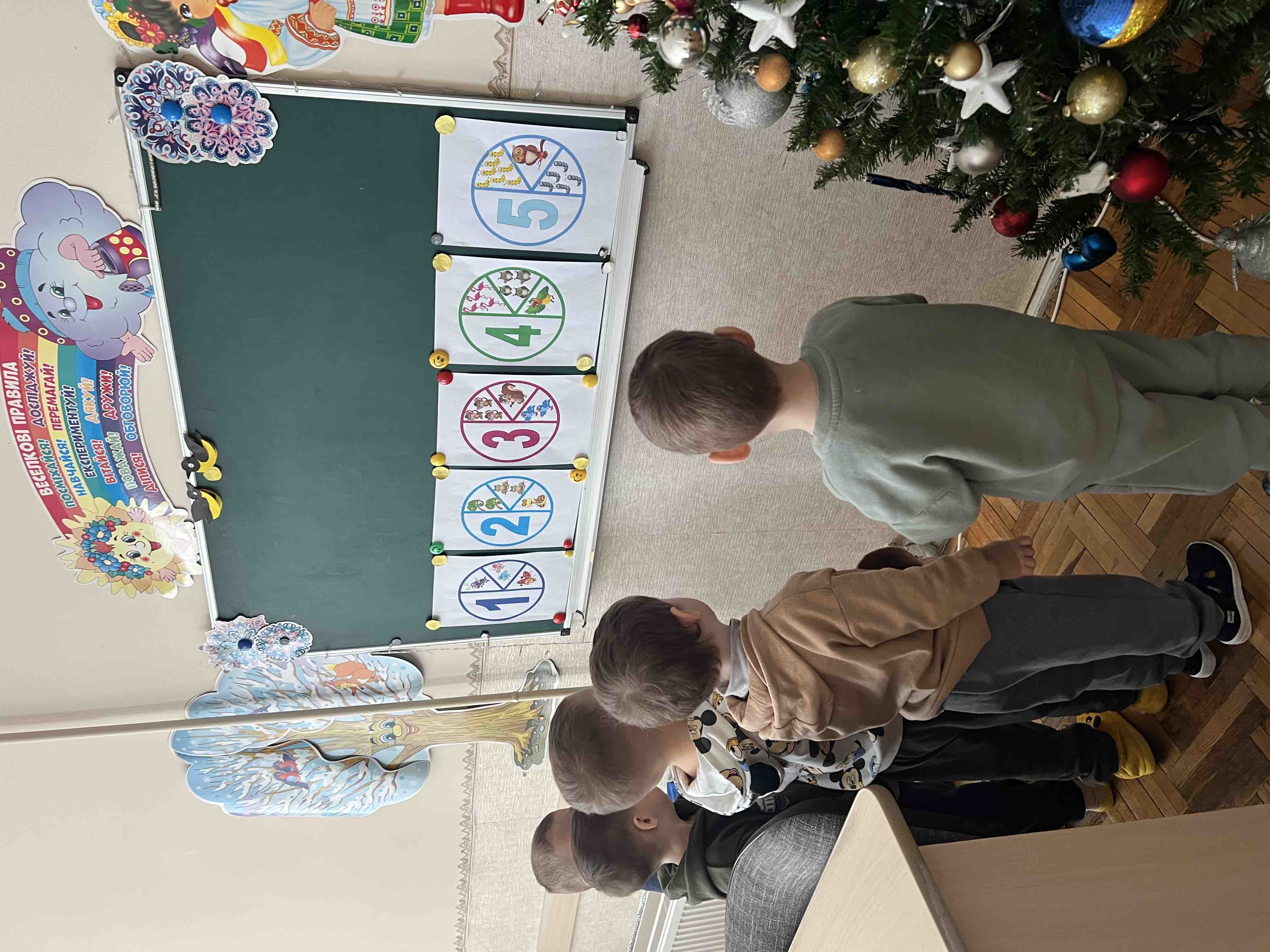 Мета: продовжувати вчити дітей рахувати в межах 5 та орієнтуватись в просторі; розвивати вміння знаходити геометричні фігури; розвивати логічне, асоціативне мислення, уяву, увагу; виховувати почуття доброти.