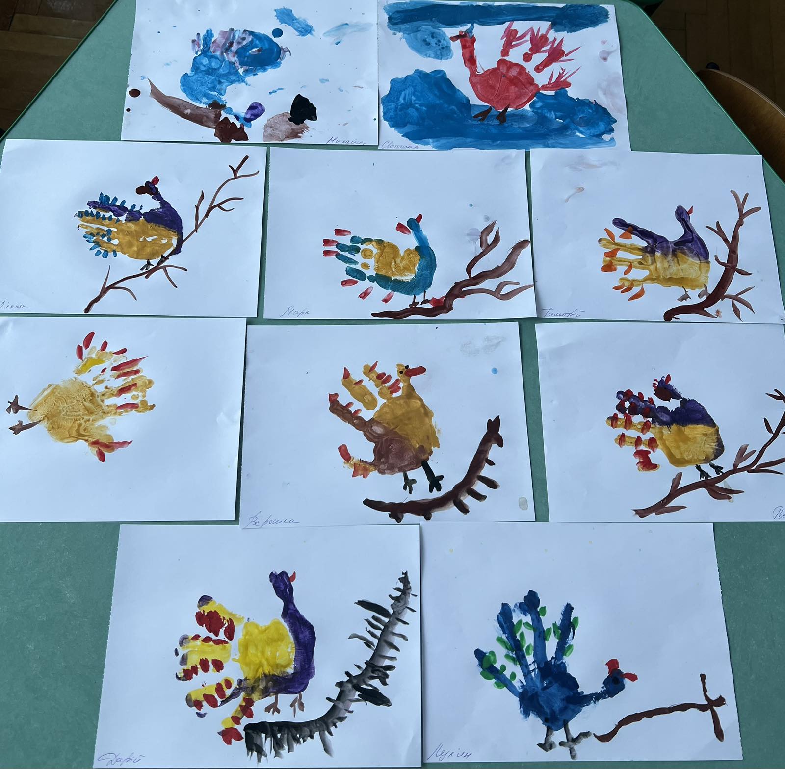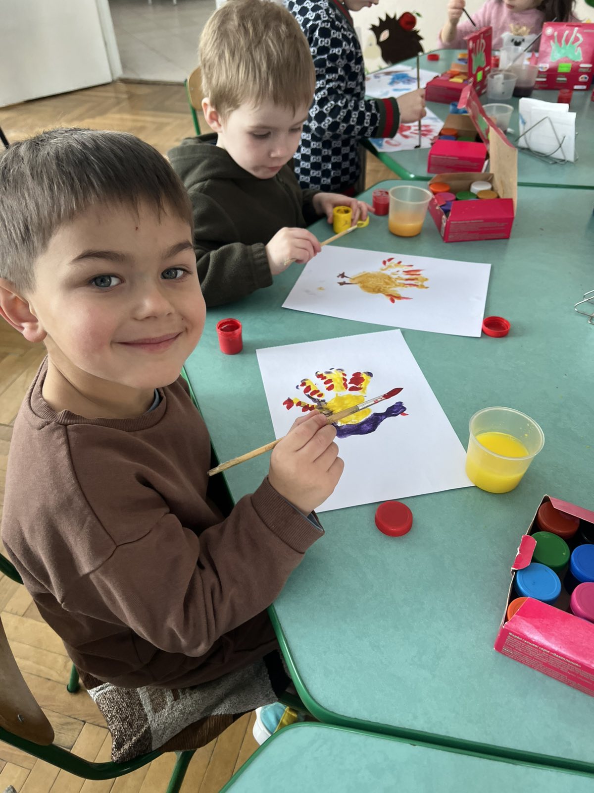 Мета: продовжувати закріплювати вміння дітей малювати долонькою, розміщувати малюнок на аркуші паперу; добирати кольори створюючи відповідний колорит малюнку; розвивати творчу уяву та естетичний смак; розвивати емоційне сприймання краси навколишнього світу; виховувати наполегливість, самостійність,цікавість до створення власних творчих робіт.