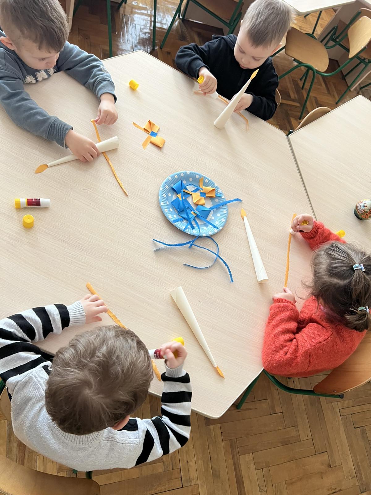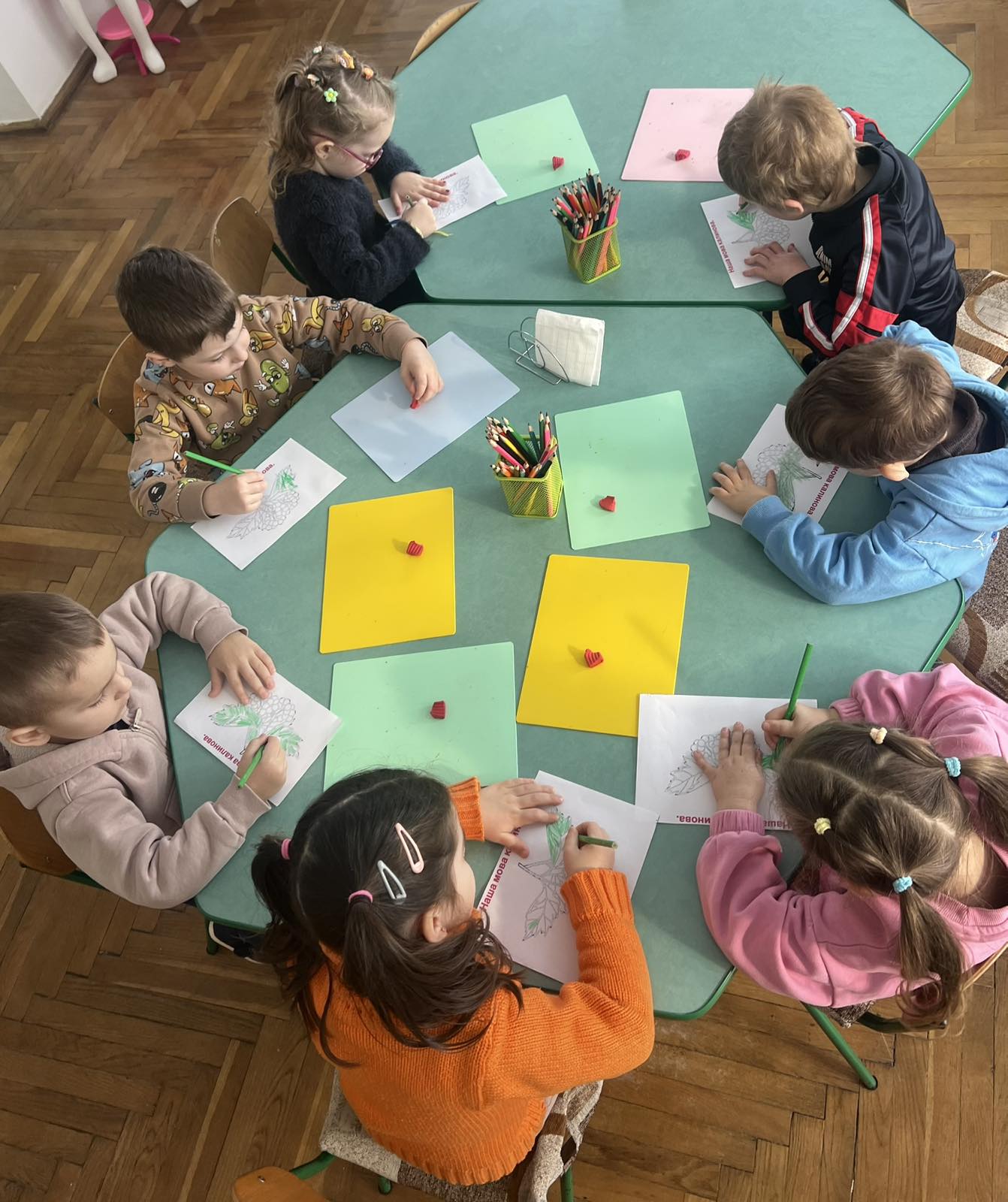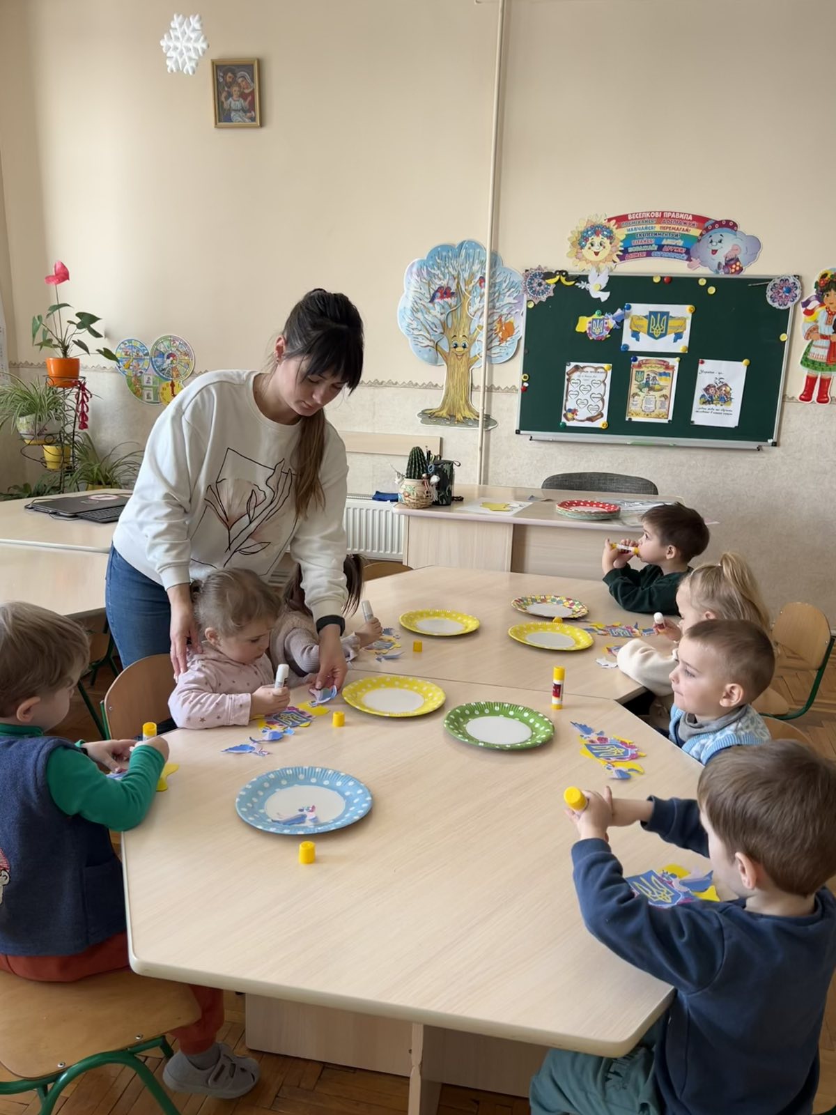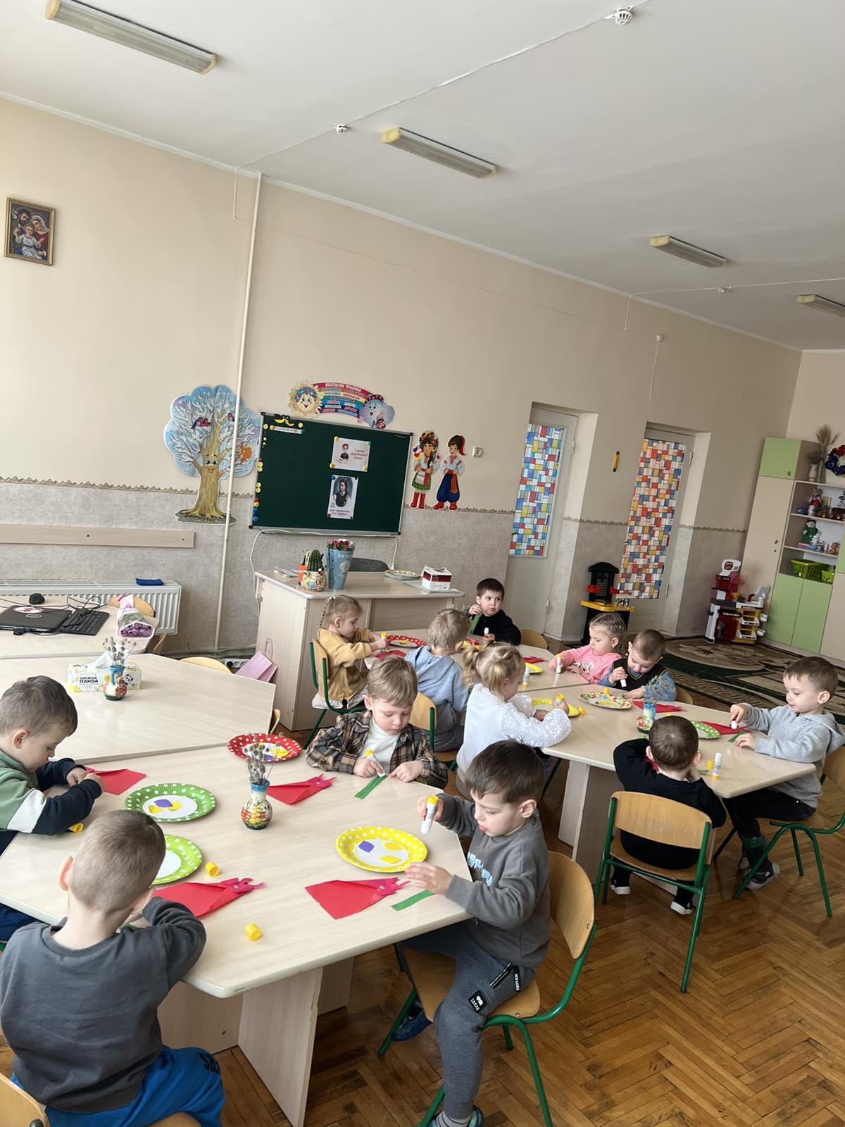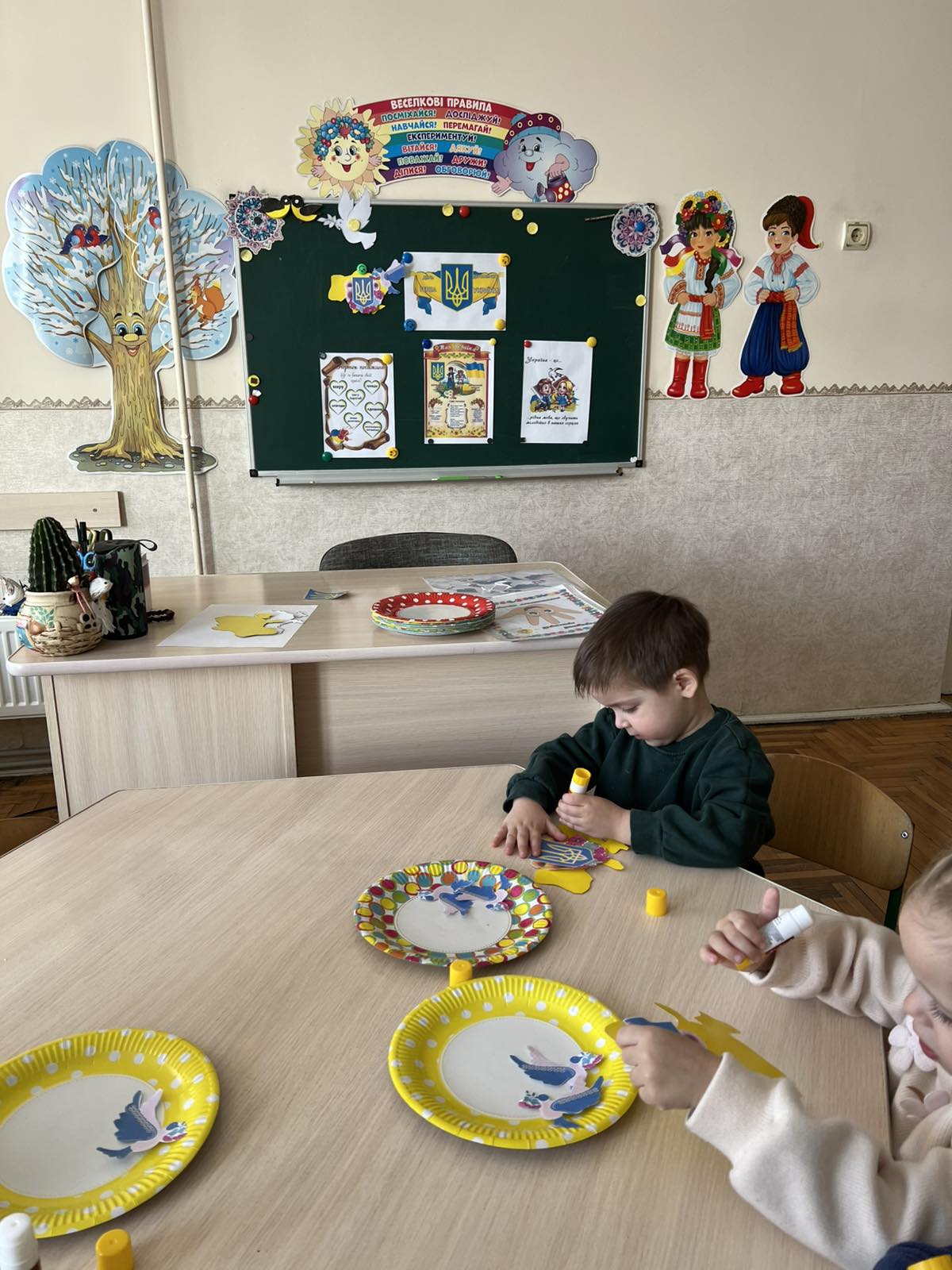 Мета: вчити дітей працювати з різними матеріалами, продовжувати вдосконалювати навички правильної підготовки робочого місця до роботи;розвивати творчість, критичне мислення, моторику дрібних мʼязів кистей рук;виховувати охайність,працю в команді.