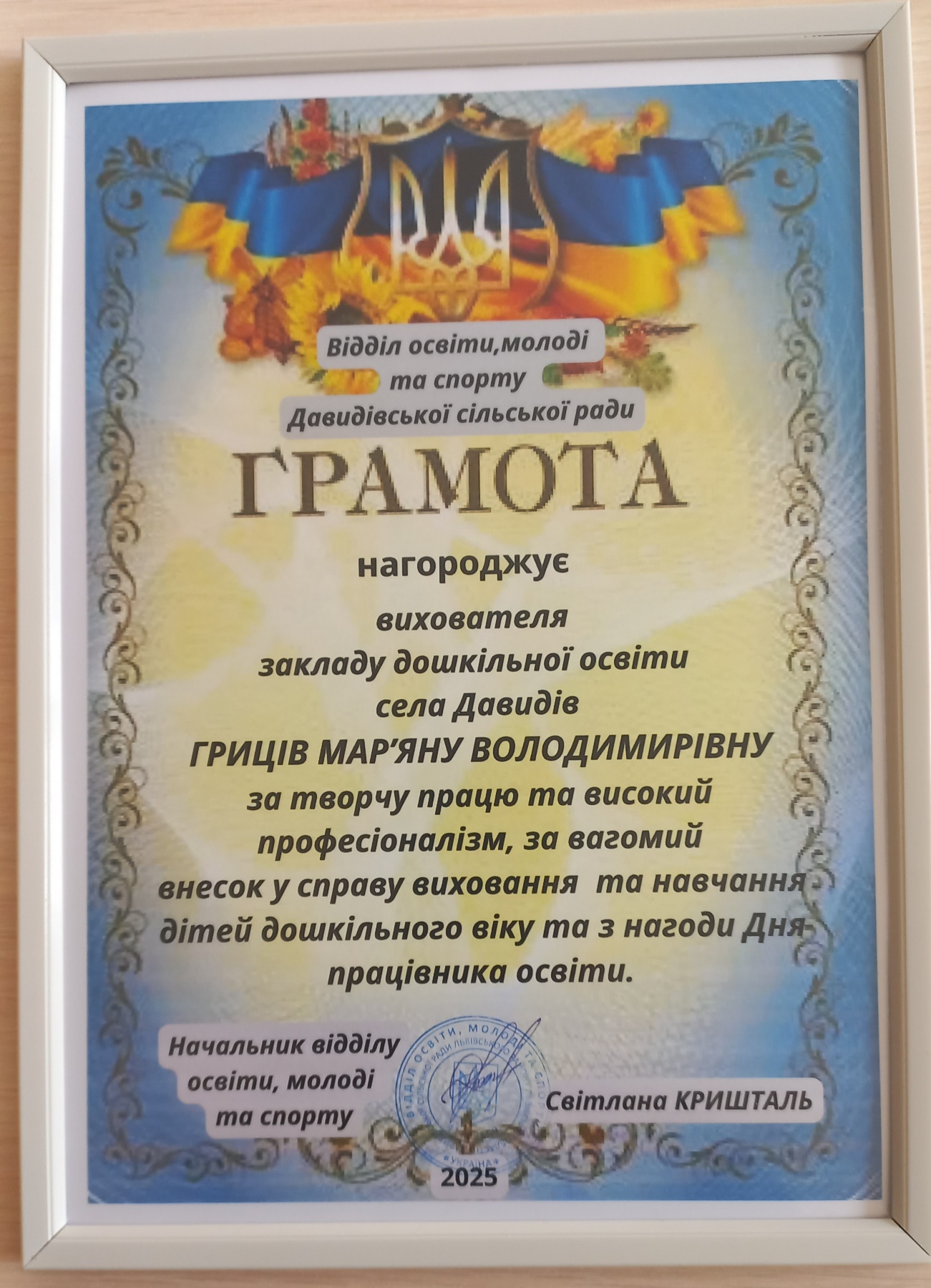 Гриців Мар'яна Володимирівна - вихователь