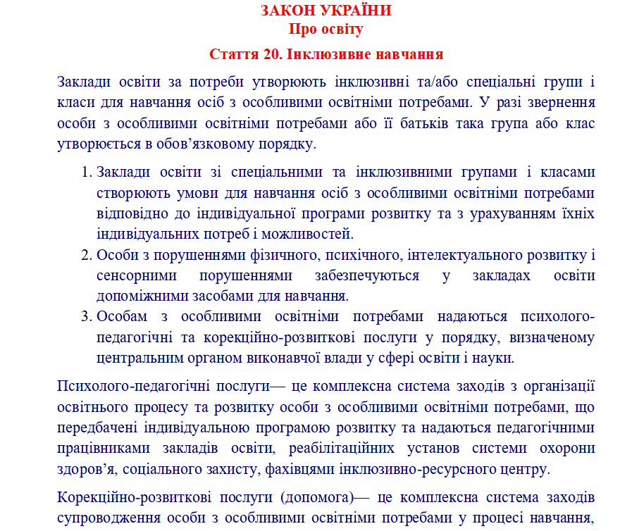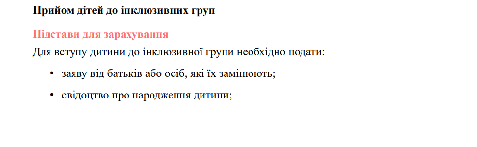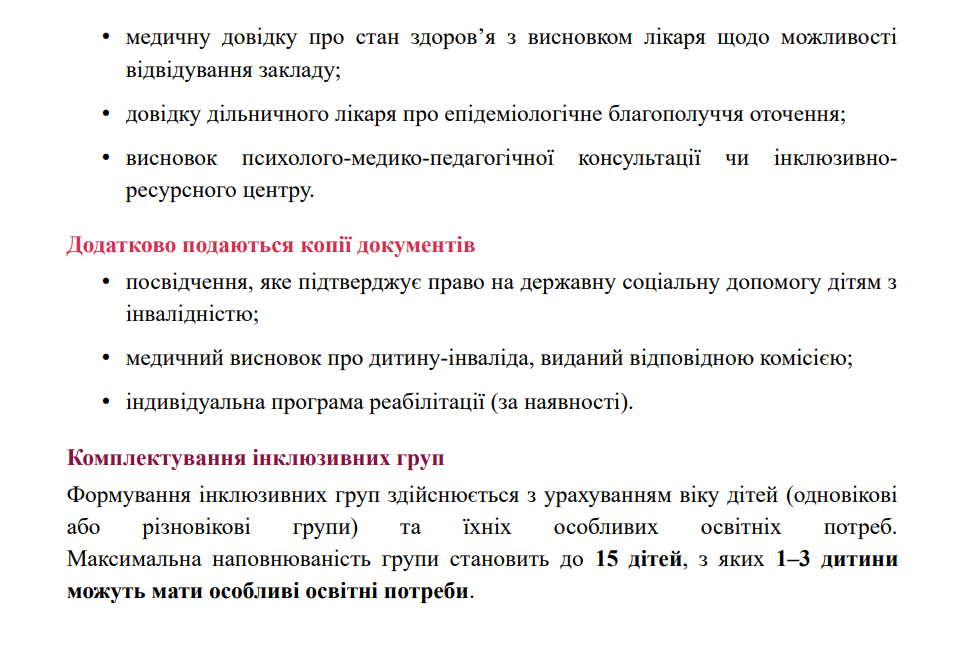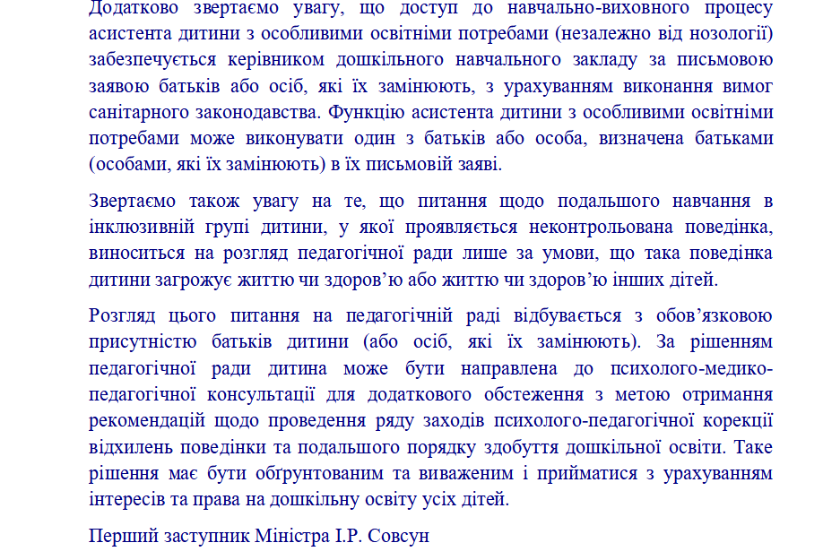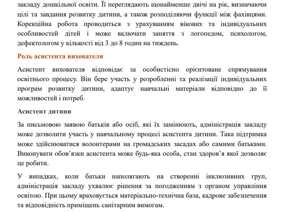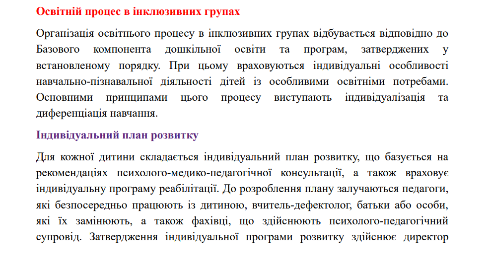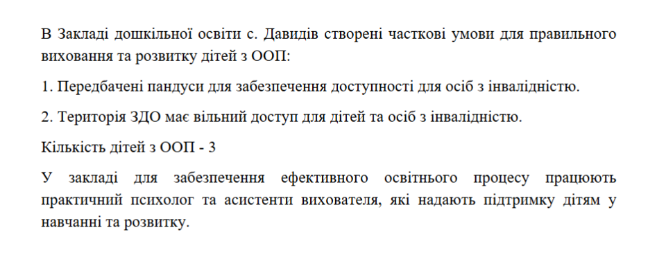 Так, на виконання закону України «Про дошкільну освіту» (статті 2, 3, 9, 11, 12, 14, 19, 23, 28, 33), постанови КМУ «Про внесення змін до Положення про дошкільний навчальний заклад» від 29.07.2015 №530, постанови КМУ від 10.04.2019 №530 «Про затвердження Порядку організації діяльності інклюзивних груп у закладах дошкільної освіти», методичних рекомендацій «Щодо організації інклюзивного навчання в закладах освіти у 2021/2022 навчальному році» від 30.08.2021 № 1/9-436, дотримання Положення про команду психолого-педагогічного супроводу дитини з особливими освітніми потребами у ЗДО с. Давидів від 14.09.2018 р., з метою забезпечення права дитини з особливими освітніми потребами на доступність і безоплатність здобуття дошкільної освіти, налагодження конструктивної взаємодії між учасниками освітнього процесу та об'єднання зусиль дошкільного закладу і батьків у створенні оптимальних умов для навчання, виховання і розвитку дітей з особливими освітніми потребами в умовах ЗДО, у закладі утворена інклюзивна група. Розроблена чітка система роботи з дитиною з ООП (система розробляється на кожен навчальний рік), враховуючи вік дитини. Надаються психолого - педагогічні та корекційно - розвиткові послуги дітям з ООП відповідно до індивідуальної програми розвитку та висновку інклюзивно - ресурсного центру.
