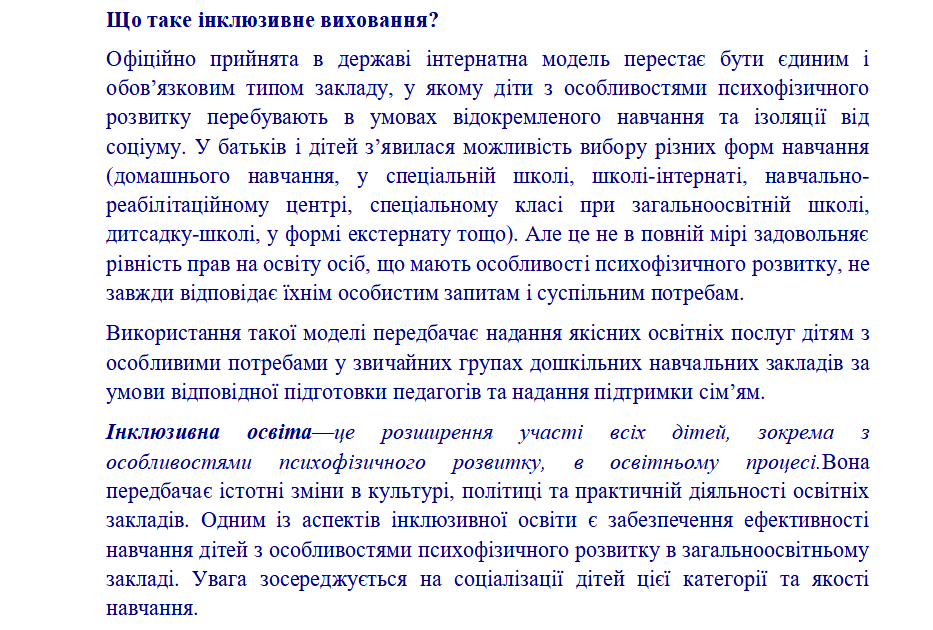 Впровадження інклюзивної форми навчання та виховання в закладі дошкільної освіти - це крок назустріч дитині, це нові підходи до навчання дітей з ООП: