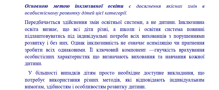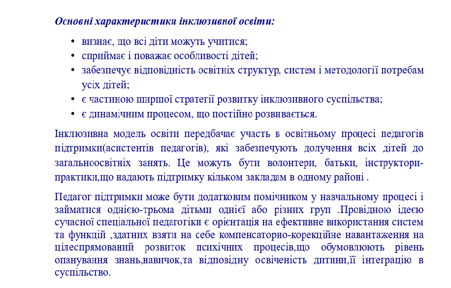 не дитина повинна підлаштовуватися під загальну систему навчання і виховання, а саму систему слід спрямовувати на задоволення потреб та інтересів кожної окремої дитини. Освітній інклюзивний простір має бути доступним для таких дітей, адже право на рівний доступ до якісної освіти за місцем проживання – це право всіх дітей. Концепція інклюзивної освіти відображає одну з головних демократичних ідей – усі діти є цінними й активними членами суспільства.